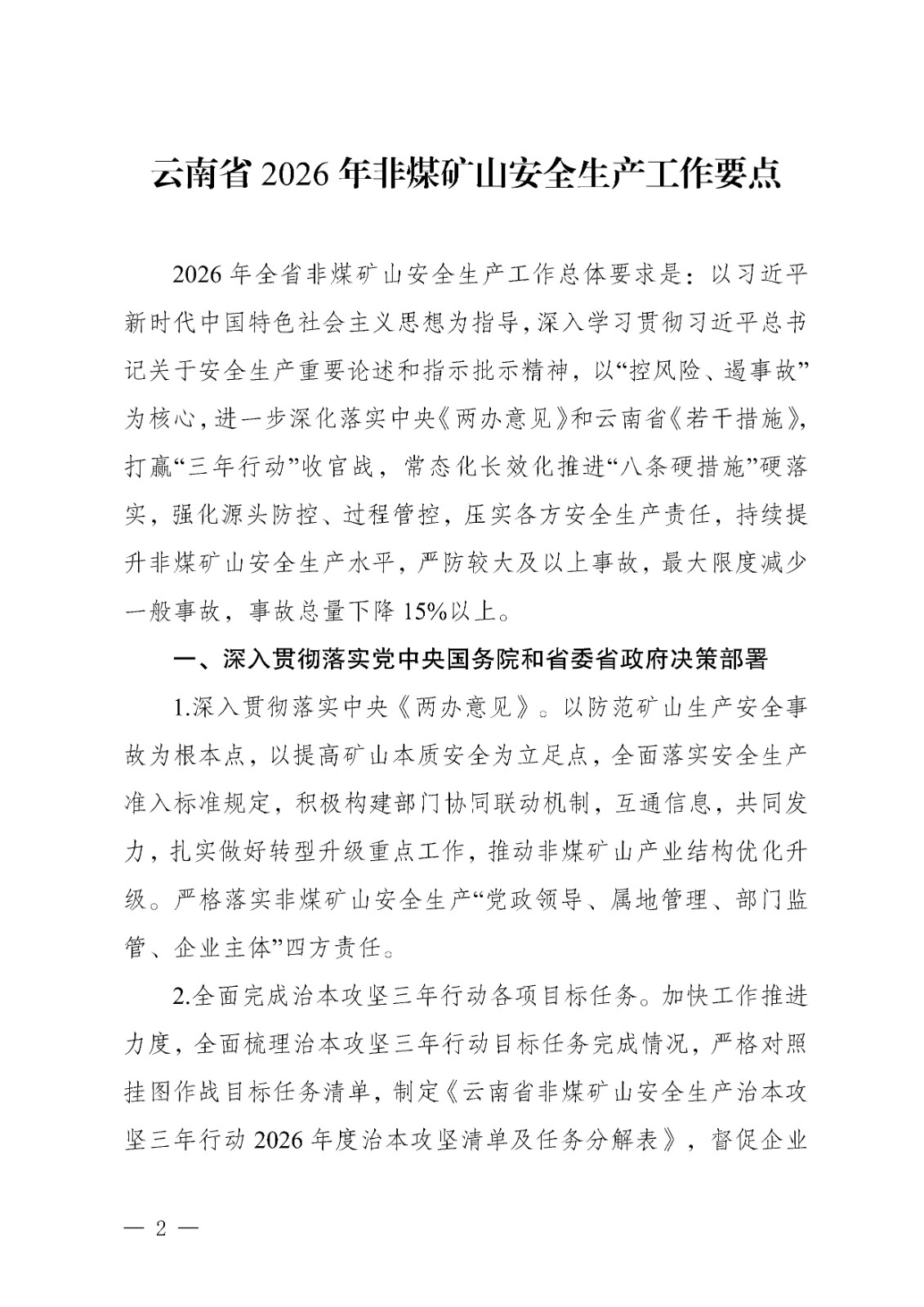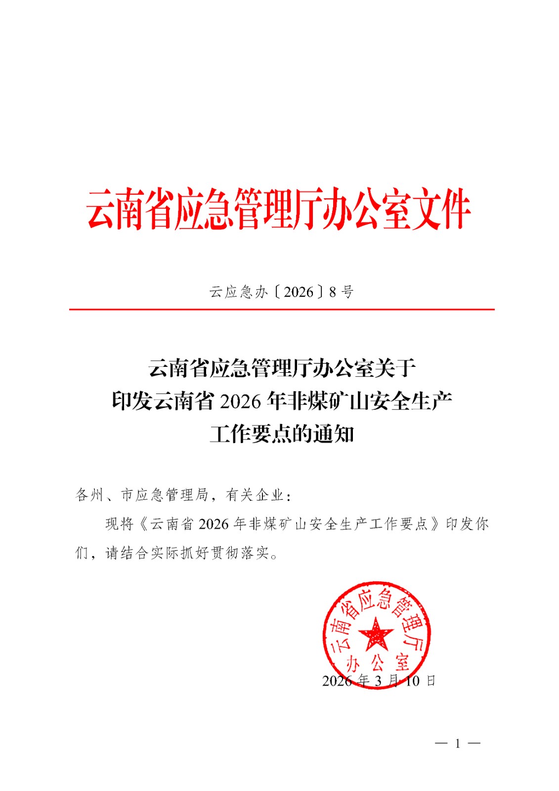 云南省应急管理厅办公室关于 印发云南省2026年非煤矿山安全生产工作要点的通知(云应急办〔2026〕8 号)